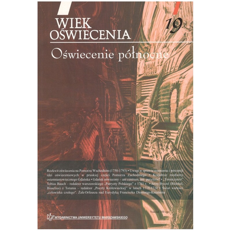 Rozkwit oświecenia na Pomorzu Wschodnim (1750-1793) * Uwagi w sprawie rezonansu i percepcji idei oświeceniowych w pruskiej części Pomorza Zachodniego * Krajobraz medialny osiemnastowiecznego Gdańska * Gdańsk oświecony - ani centrum, ani peryferie? * „Toruńczanin” Tobias Bauch - redaktor warszawskiego „Patryoty Polskiego” z l761 r. * Jerzy Byszel (Büschel, Bisselius) z Torunia - redaktor „Poczty Królewieckiej” w latach 1718-1720 * Świat wartości „człowieka czułego”. Żale Orfeusza nad Eurydyką Franciszka Dionizego Kniaźnina
